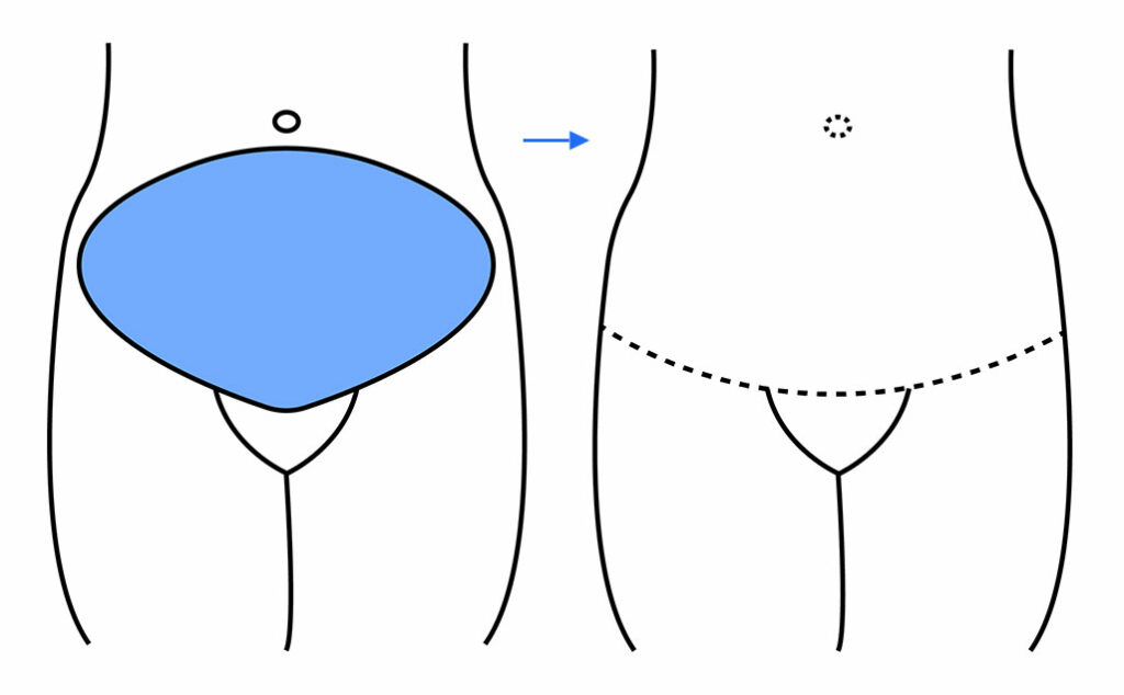 The excess skin and fat of the abdominal wall in the lower abdomen is removed leaving the umbilicus in place. The patient is left with a long, usually curved scar across the lower part of the abdominal wall at the level of the pubic hair. There is also a scar around the umbilicus. Any looseness of the muscles of the abdominal wall is repaired at the same time.