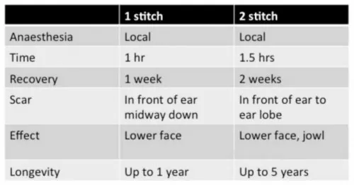 The differences between the two stitch mini facelift and the one stitch mini facelift are summarised in the following table and video. It is important to note that the effect in the neck is noticeable only in patients with a thin neck.